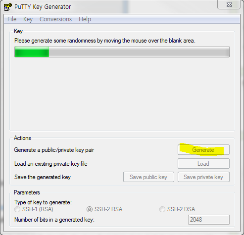 1. 다운 받은 PuTTYgen 를 실행하고 Generate 버튼을 누릅니다.