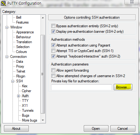 4. PuTTY를 실행해서 현재 작업할 세션을 선택한 후 Connection의 SSH 의 Auth 를 선택한 후 Browse를 눌러 아까 저장한 개인키를 지정합니다.