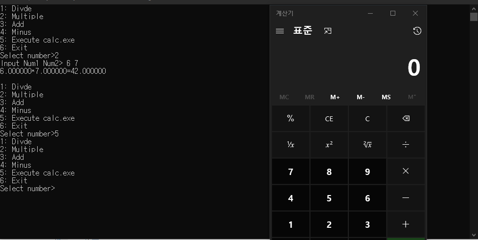 명령 프롬프트에서 4칙연산 수행(1~4)하고 윈도우 계산기를 자식 프로세스로 실행(5)하는 예제입니다.