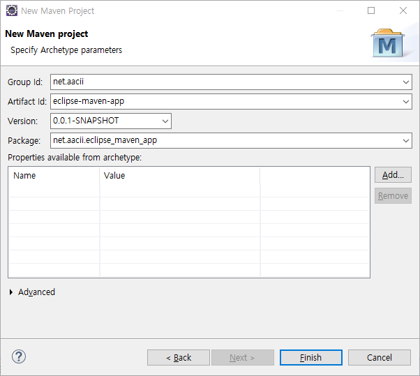 위와 같이 Artifact Id 가 maven-archetype-quickstart 을 선택합니다.