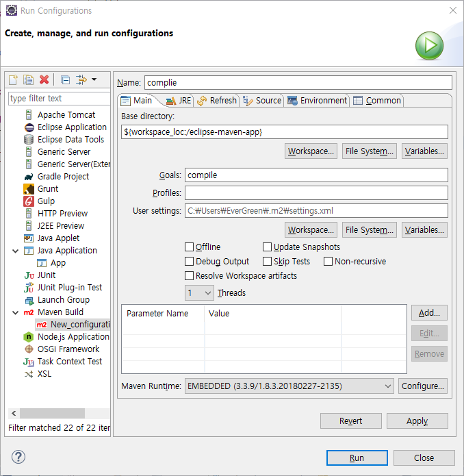 이클립스의 메이븐의 기본적인 골(build, test 등)은 Run 메뉴 안에 있습니다.