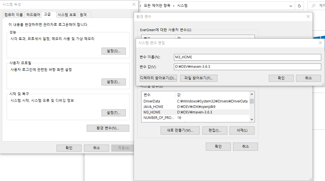 값: maven이 설치된 경로(예: D\DEV\maven-3.6.3)