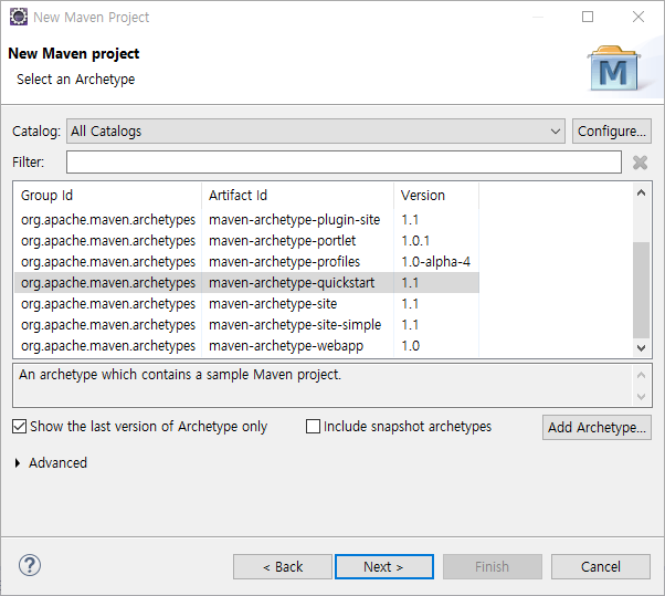 아키타입으로 생성하려면 Create a simple project(skip archetype selection)을 체크 해제 하고 Next를 누릅니다.