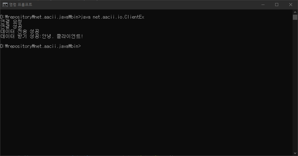 java 환경변수가 설정되어 있는 상태에서 cmd로 bin 경로로 이동한 후 java 패키지이름.ClientEx 를 실행하면 cmd에서 클라이언트 측 프로그램을 실행 할 수 있습니다.