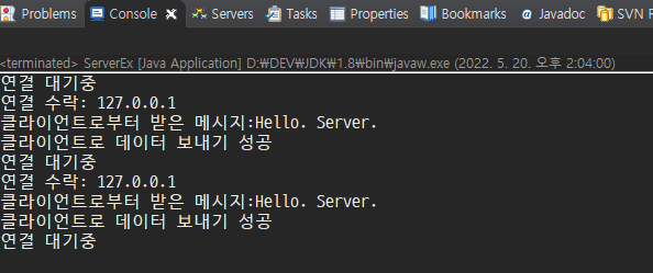 실행 테스트 할 때 주의할 점은 ServerEx는 이클립스에서 먼저 실행한 상태에서 ClientEx를 나중에 실행시켜야 한다는 점입니다.