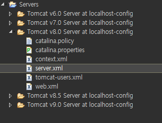 이클립스에 톰캣을 정상적으로 세팅했다면 Servers폴더에 server.xml 파일이 있을 것입니다.