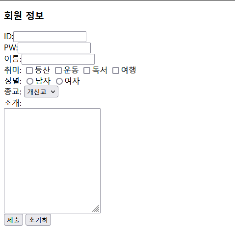 form 태그에는 text , checkbox, radio, select, textarea, submit 등의 컴포넌트들이 있습니다.