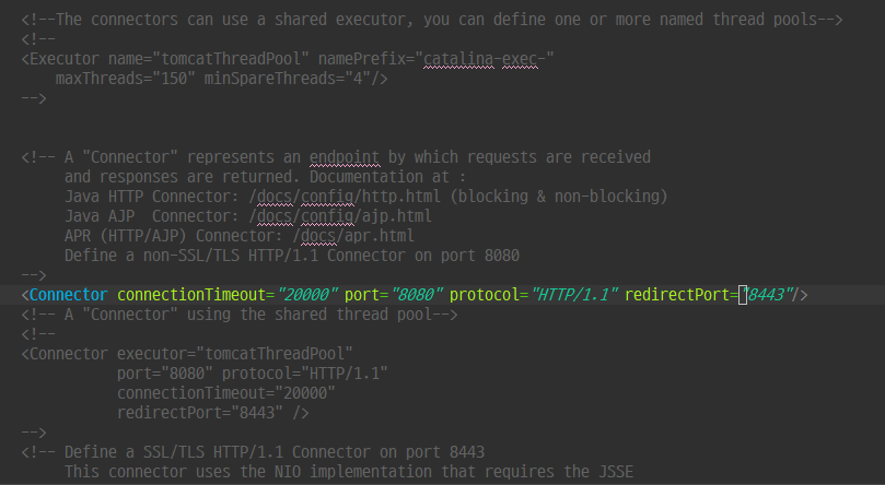 <Connector connectionTimeout="20000" port="8080" protocol="HTTP/1.1" redirectPort="8443" URIEncoding="UTF-8"/>