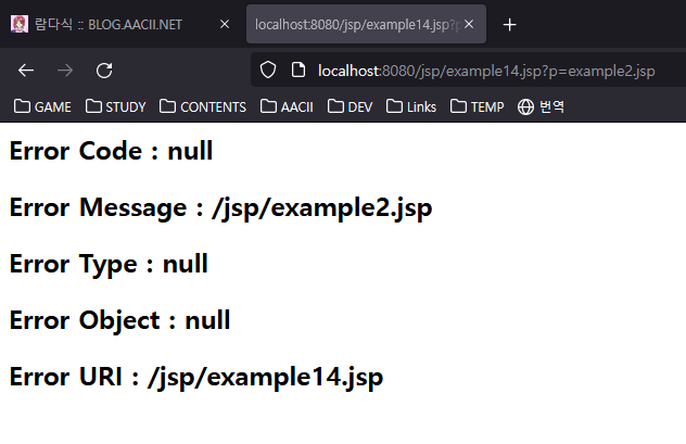 request parameter인 ?p=example2.jsp 을 받아 example14.jps에서 example2.jsp으로 forward 합니다.