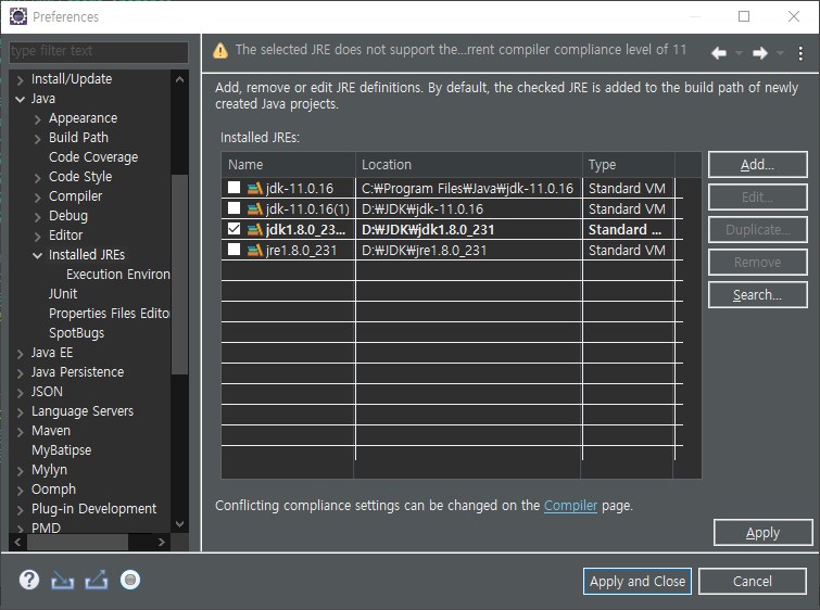 Installed JREs... 버튼을 눌러 JDK8 이 설치된 경로를 찾아서 JRE를 지정해줍니다.