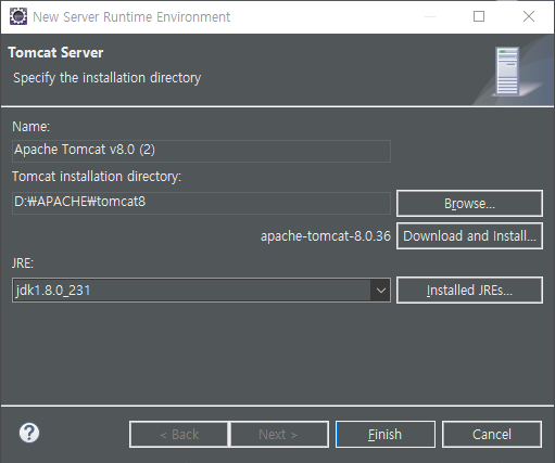 그러면 default JRE가 11이더라도 JRE8 에서 tomcat8을 구동시킬 수 있습니다.