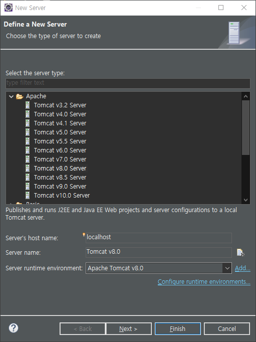 아래 처럼 이클립스에 tomcat8(Server runtime environment)를 추가할 때 우측에 Add... 링크를 눌러서