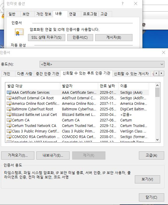 윈도우 업데이트(루트인증서 업데이트)를 하시면 인증서를 업데이트 할 수 있습니다.