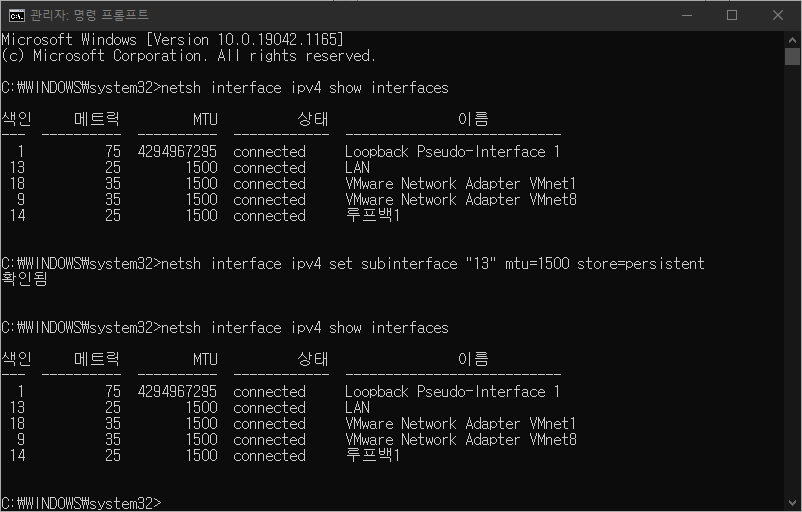 netsh interface ipv4 set subinterface "네트워크인터페이스색인" mtu=바꿀MTU값 store=persistent