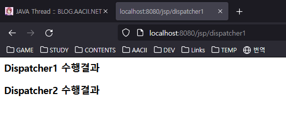 DispatcherTest.java 서블릿에서 rd.forward(req, resp); 부분을 rd.include(req,resp); 으로 수정하면 아래와 같이 하나의 화면에 두개의 서블릿 결과가 포합되어 표시됩니다.