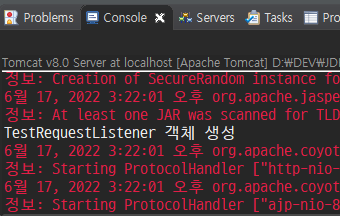 방금 위에서 등록했던 web.xml의 TestServletContextListener 리스너를 주석 처리하고 TestServletContextListener.java 파일 클래스 이름 위에 어노테이션을 추가한 뒤 테스트를 해봅시다.