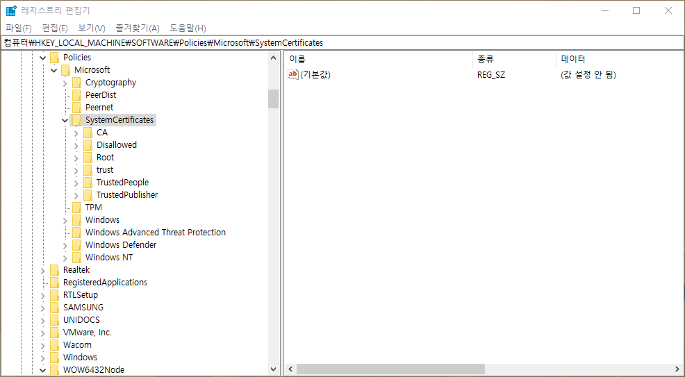 HKEY_LOCAL_MACHINE\SOFTWARE\Policies\Microsoft\SystemCertificates\AuthRoot 경로로 가십시오.