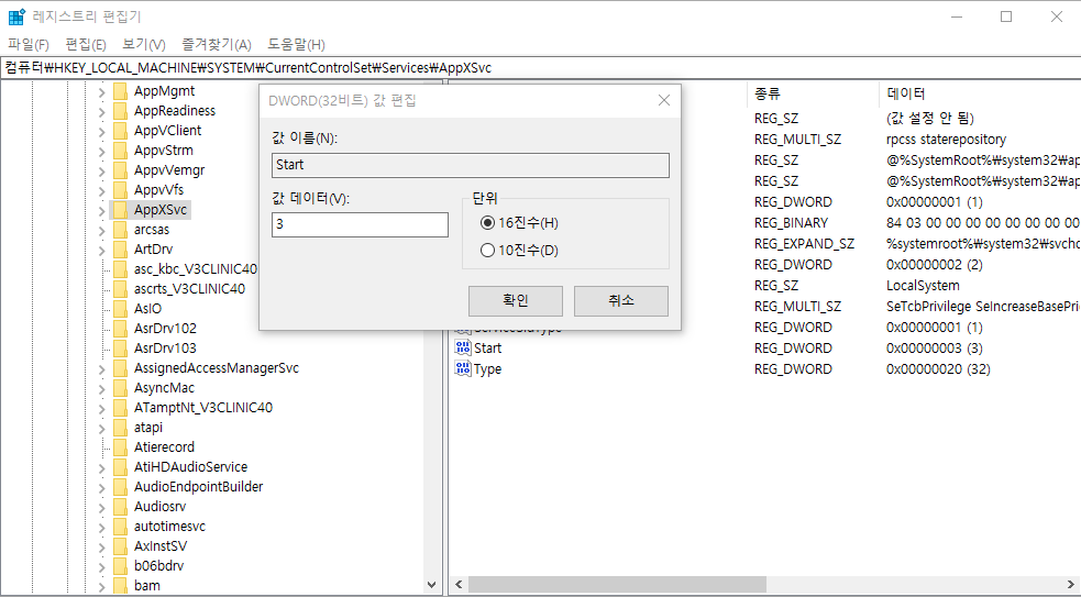 해당 서비스를 사용 목적에 맞게 값 데이터(16진수)를 수정하시면 됩니다.