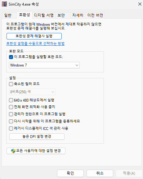 에 SimCity 4.exe 를 우클릭 > 속성 > 호환성 탭에서